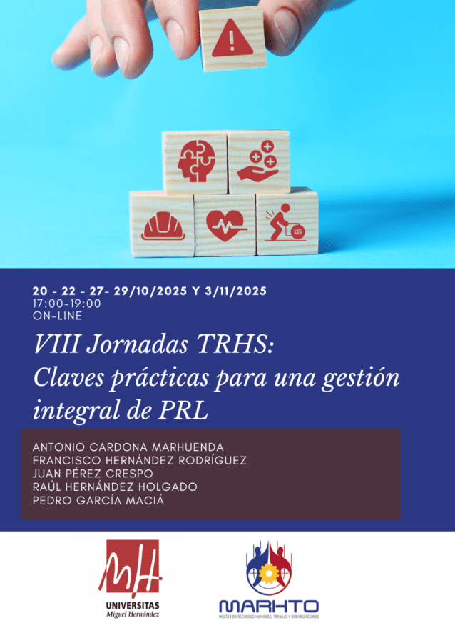 El Máster en Gestión de Gestión de Recursos Humanos, Trabajo y Organizaciones celebra un nuevo ciclo de jornadas, las VIII Jornadas de Trabajo, Recursos Humanos y Salud: Claves prácticas para una gestión integral de PRL centradas como siempre en la Prevención de Riesgos Laborales (PRL), con un enfoque práctico y aplicado a distintos contextos profesionales.